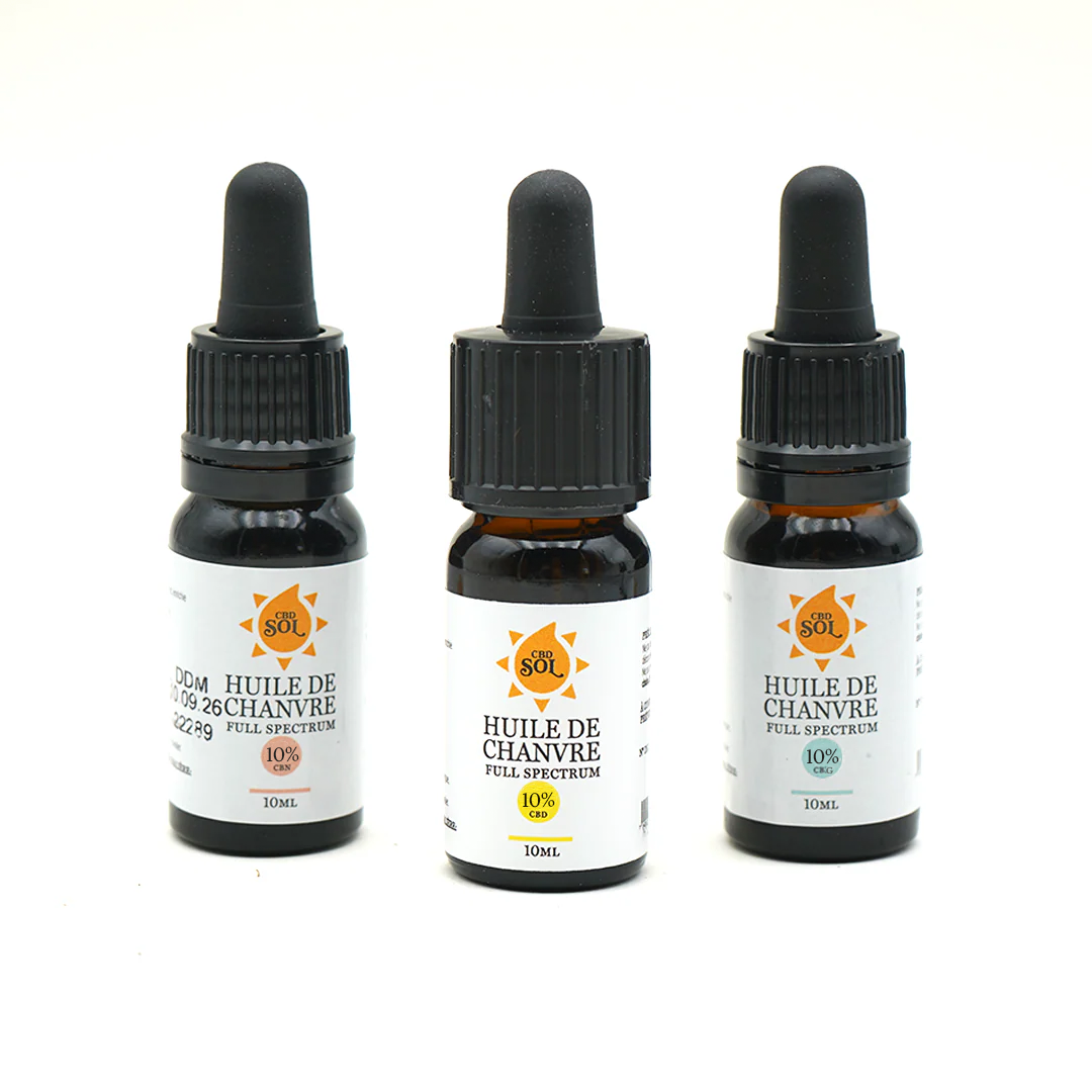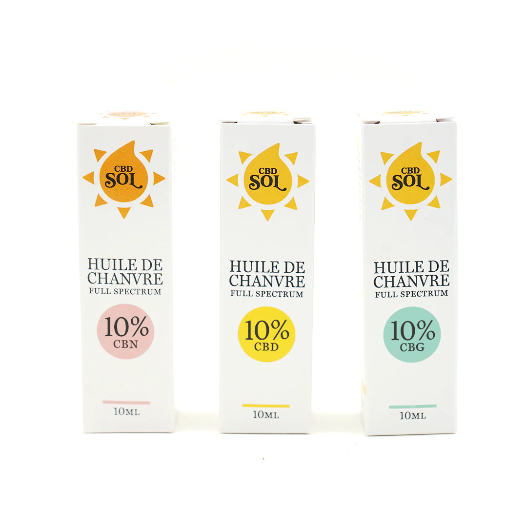 Los cannabinoides suelen tener propiedades diferentes. Si aún no te has decidido entre CBD, CBG y CBN, hemos preparado un pack de tres aceites para ayudarte a descubrir estas tres moléculas. Este pack contiene 1 frasco de 10 ml de extracto de Cannabidiol (10%), 1 frasco de 10 ml de extracto de Cannabigerol (10%) y 1 frasco de 10 ml de extracto de Cannabinol (10%). Esto te da la oportunidad de descubrir estos cannabinoides, probarlos y encontrar el adecuado para ti.